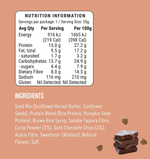 Sunflower Seeds, Protein Blend (Rice Protein, Pumpkin Seed Protein), Brown Rice Syrup, Soluble Tapioca Fibre, Cocoa Powder (3%), Dark Choc Chips (2%), Acacia fibre, Sweetener (Allulose), Natural Chocolate Flavour (<2%), Salt
