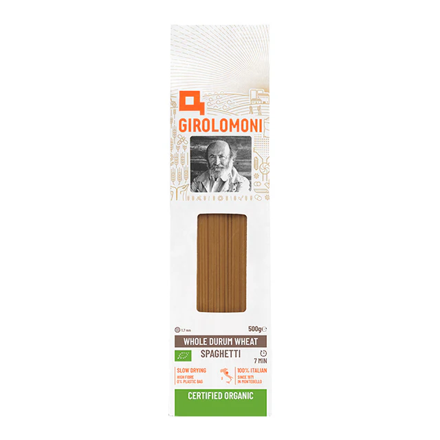 Unit price perThis wholemeal spaghetti is made from durum wheat flour with the bran left in to create a wholemeal pasta that pasta cooks to a perfect al dente. Perfect with prawns sautéed with garlic and fresh chilli - toss through the pasta with fresh lemon juice and Girolomoni Extra Virgin Olive Oil.