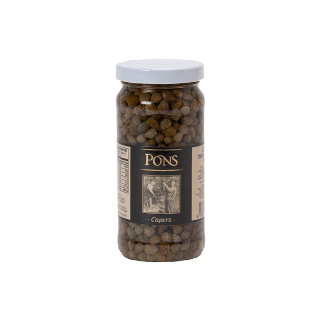 Unit price perFine (7mm), quality Spanish capers, bottled in brine. Pons capers are a wonderfully versatile ingredient, adding a delicious salty kick to so many meals. Try using Pons capers in salads, pasta dishes or risotto, as a topping on pizza, in a salsa verde or paired with seafood.