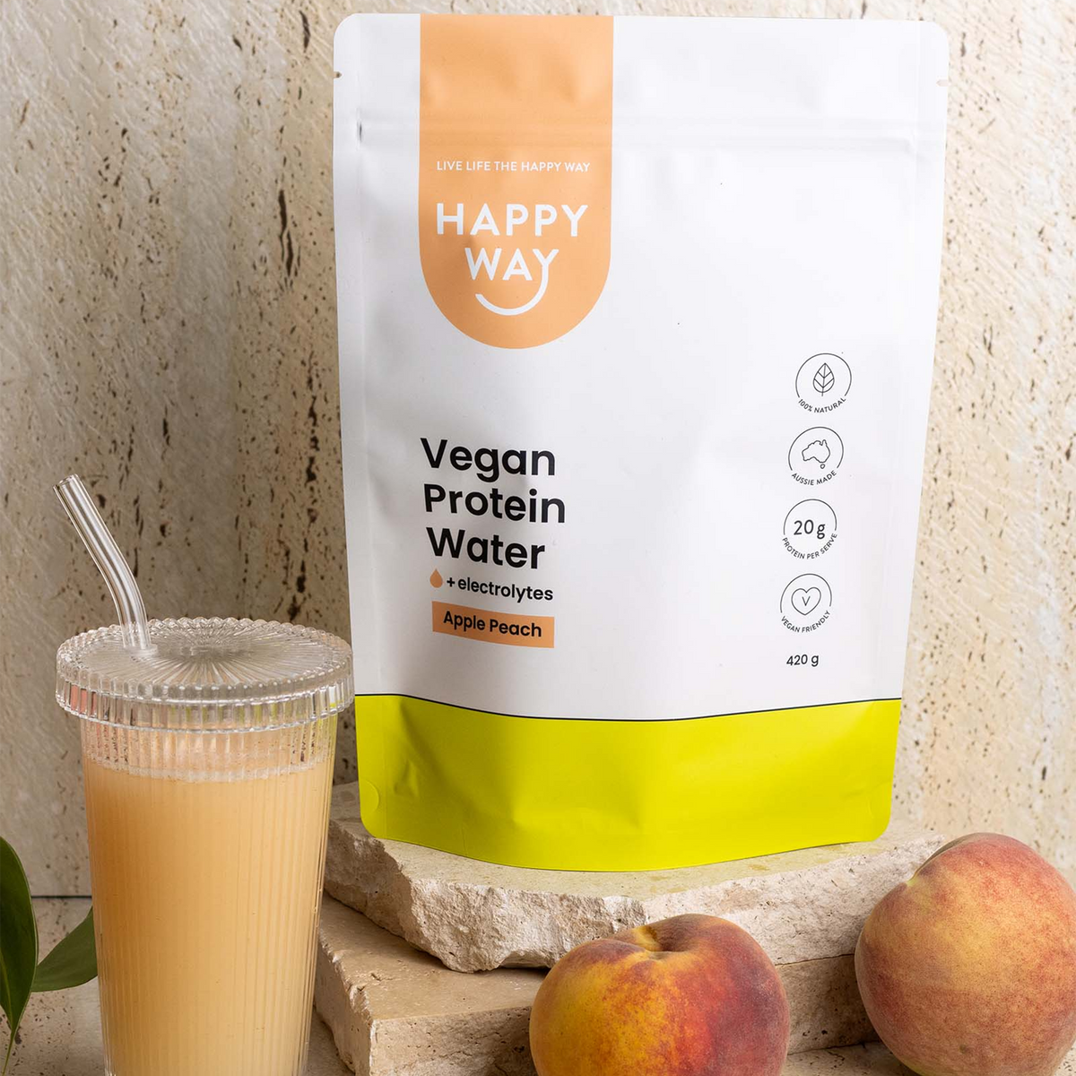 But this isn't just any beverage – it's a powerhouse of goodness! Packed with 20g of vegan protein per serving, our Apple Peach Protein Water is here to fuel your active lifestyle. Whether you're hitting the gym, going for a run, or just enjoying the great outdoors, this drink is your perfect companion.