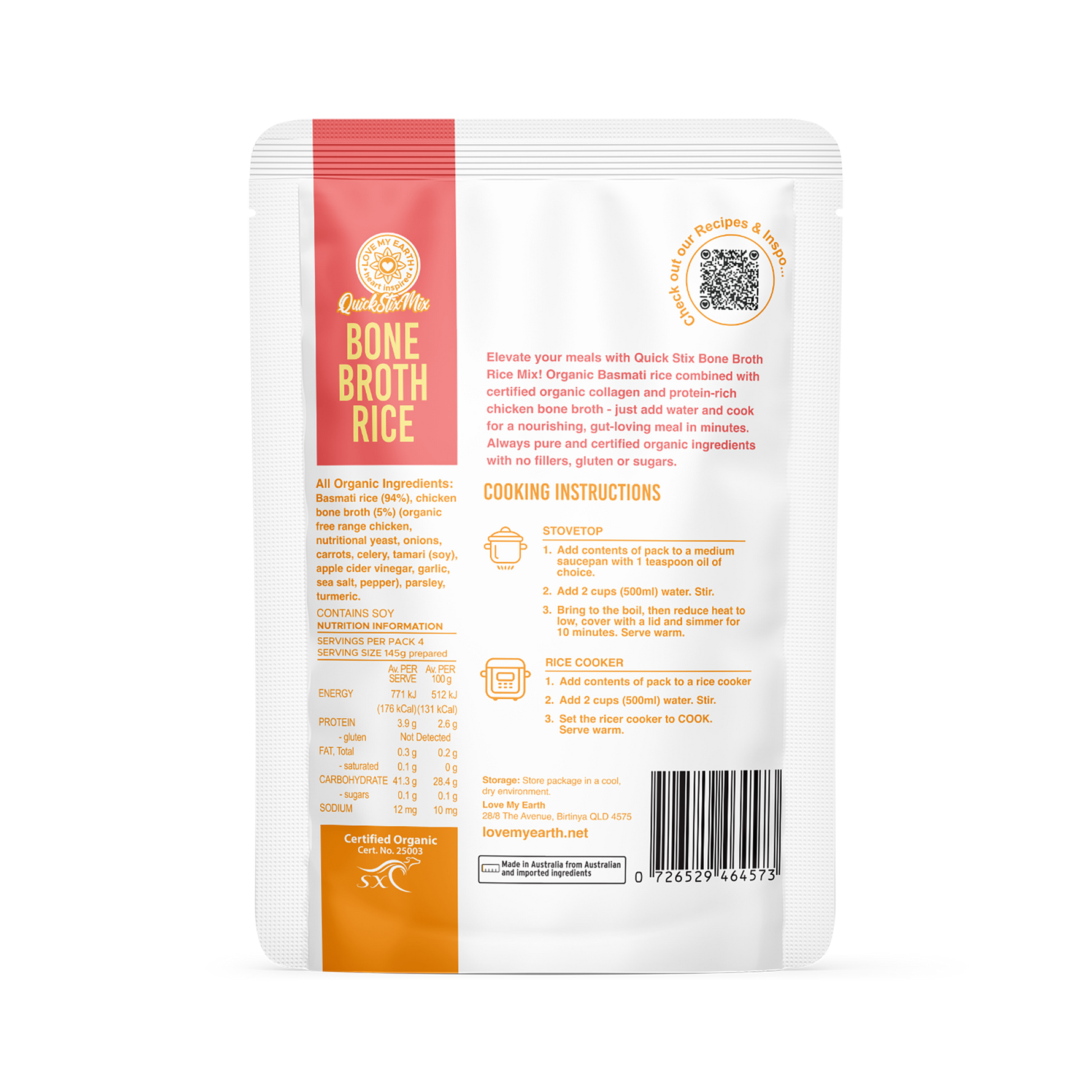 Unit price perElevate your meals with Quick Stix Bone Broth Rice Mix! Organic Basmati rice combined with certified organic, collagen and protein-rich chicken bone broth - just add water and cook for a nourishing, gut-loving meal in minutes.